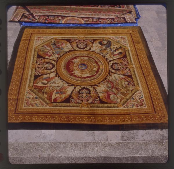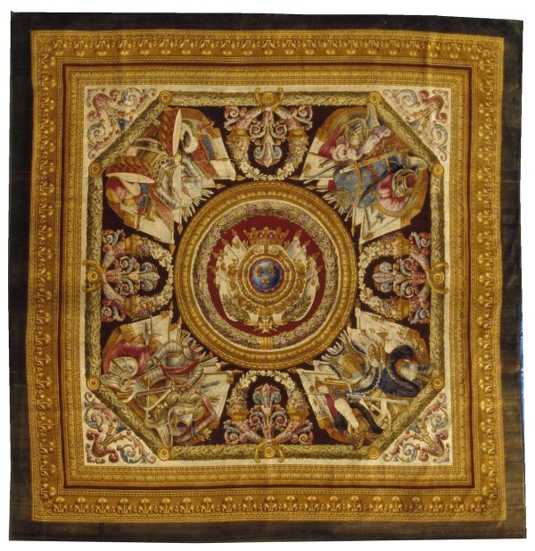Carton : 1822 -Grand caisson fond grenat, milieu à médaillon rond au entre un écusson fond bleu aux anciennes armes de France surmonté d'une couronne royale fleurdelysée avec le collier des ordres de Saint Michel et la Croix du St Esprit, dessin jaune 2 tons. Trophée de drapeaux en grisaille et blanc sur fond rouge, couronne de laurier rose sur fond blanc. Double bordure à feuilles d'ornement et listels jaune 2 tons sur fond brun. Encoignure à trophées d'armes, armures, casques, panaches et instruments de musique à dessin colorié 4 motifs à fleurs de lys et ornements coloriés entre deux cornes d'abondance enlacées d'où sortent des fruits et fleurs de lys en forme de guirlande, le tout sur fond grenat encadré d'une bordure à feuilles de laurier et rosaces jaune. Aux angles un motif à rinceaux d'enroulement coloriés sur fond blanc ; ce tapis est encadré d'une double bordure, 1ère à feuilles d'acanthes volutes rang de perles et listels jaune 2 tons, 2ème à feuilles d'ornements et fleurs de lys couleur or imitant un cadre sur fond brun. Bordure extérieure vert uni.