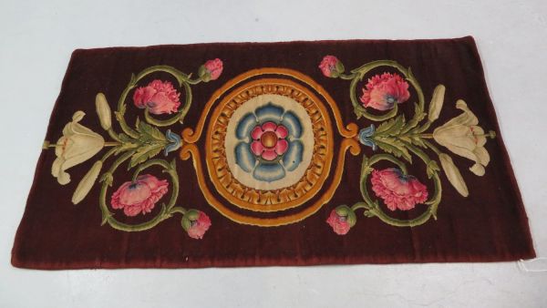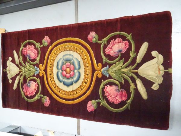 Tapis de foyer à fond nègre avec rosace centrale bleue à coeur rose et or sur un fond blanc circulaire, à cadre mouluré or et à rais de coeur. Au pourtour, deux joncs en demi-cercle. Extrémités à rouleaux supportant une fleur de lys blanche à deux boutons symétriques et deux pavots au coeur des branches en volutes.