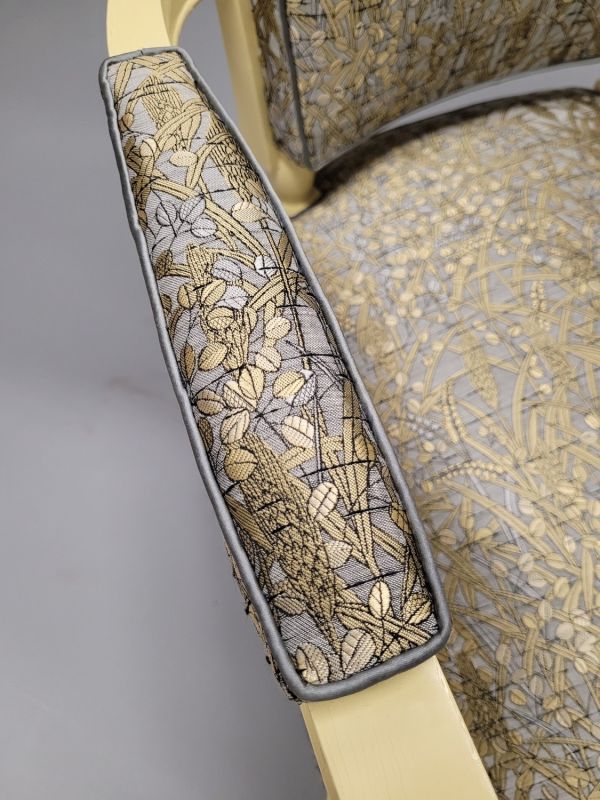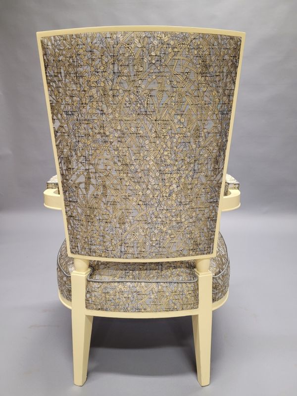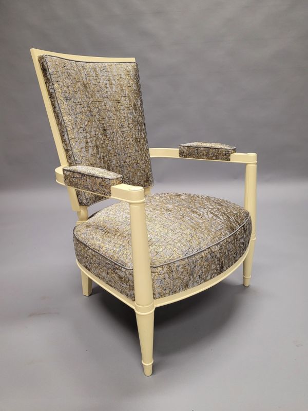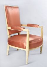 Pieds antérieurs formant supports d'accotoir et saillant en angle, tournés en deux gaines à bague. Pieds postérieurs carrés en gaine. Petite ceinture demi-circulaire à listel arrondi à la base, devanture convexe. Accotoirs plats, cintrés au dossier, tête arrondie à macaron méplat. Dossier dégagé sur olives. Siège, dossier et manchettes à épaisseur.