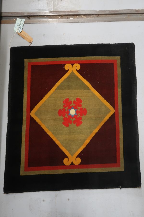 Caisson bordeaux bordé orange et gris, losange central gris à listels or, volutes doubles aux extrémités, rosaces rouges à coeur en étoile bleue, centre blanc - pourtour noir et large.