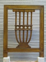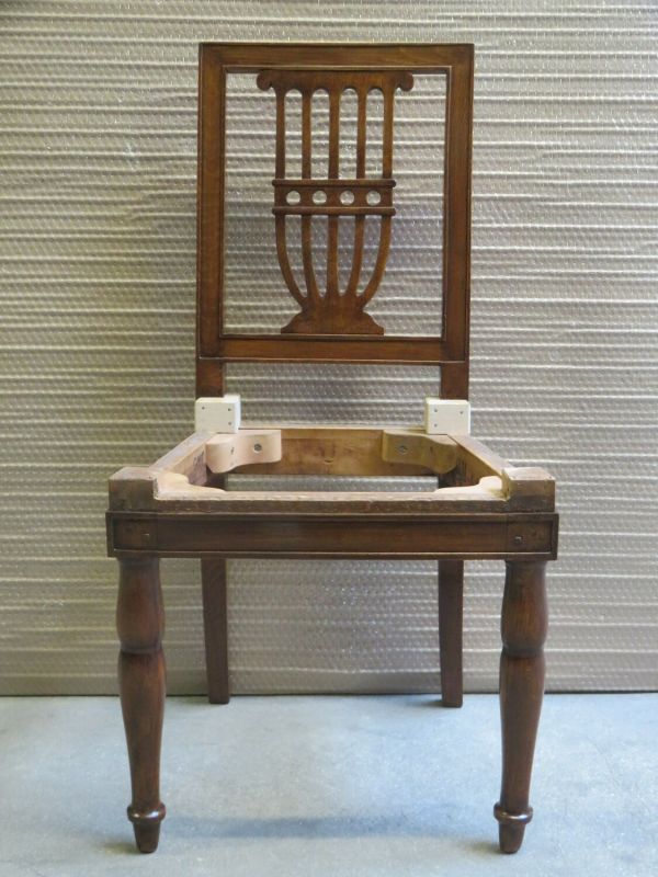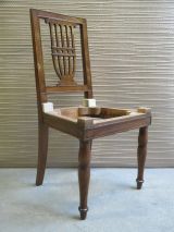 Pieds antérieurs tournés double poire sans bague. Pieds postérieurs sabre. Ceinture à fond creux sans dés. Dossier dégagé face fond creux et à grille découpée ajourée en forme de calice. Siège à épaisseur sans ressort.