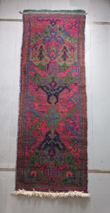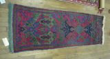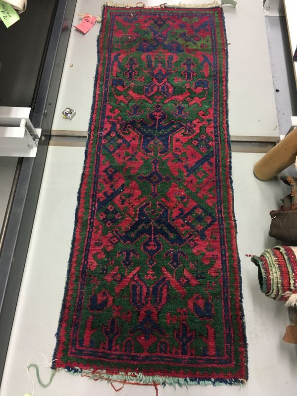 rectangle rouge brique décoré de 2 culots stylisés bleus foncés portant découpage vert ajouré, le fond du tapis à entrelacs rectilignes en diagonale, en crochets, verte - ce tapis étant disymétrique, une extrémité à un décor ovoïde fait de gros traits verts et bleus en lignes très enchevêtrées - listel de bordure rouge et vert en dents de scie emboitées - aux 2 extrémités franges ; sur un côté celles-ci sont nattées et vertes, de l'autre côté blanches.