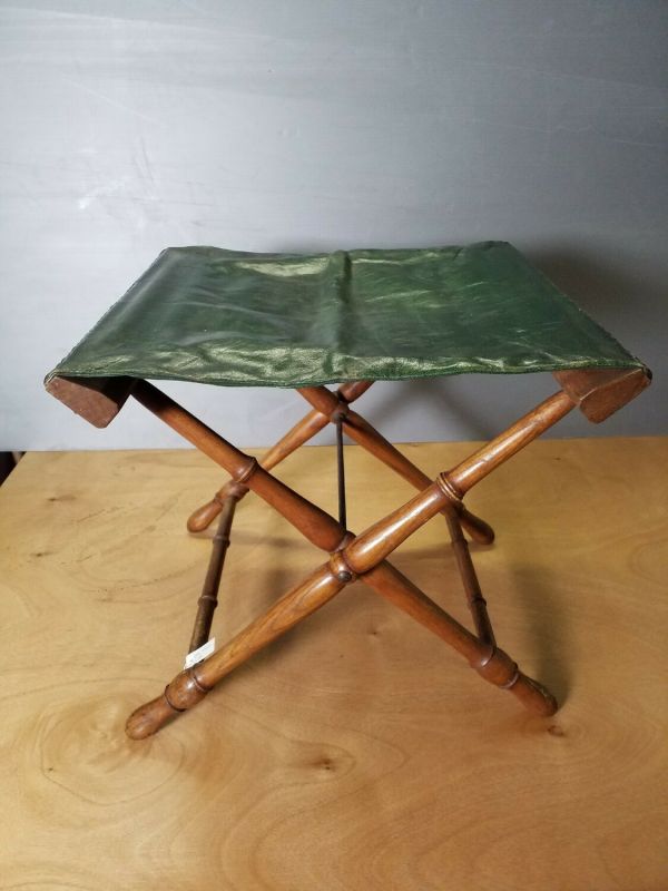 Le 6 mai 1845, « Douze pliants en bois, couverts en maroquin vert, galons et clous dorés, six étuis en treillis garnis de peaux de veau » furent livrés par l’atelier des tapissiers du magasin des fêtes du Garde-meuble avec la précision suivante : « objets destinés au campement de Mr le Duc de Montpensier » (AN, AJ/19/860).
