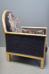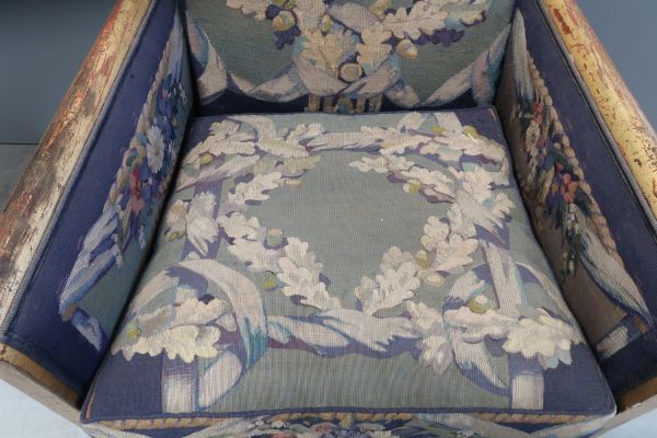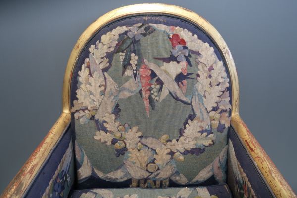 Garniture : tapisserie des Gobelins d'après un modèle de G.-L. Jaulmes, fond bleu roi à décor de guirlandes de feuilles de chêne et de fleurs des champs, enrubannées de bleu sur fond vert pâle. Entoilage postérieur crème.