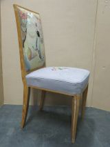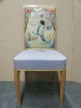 Pieds antérieurs en angle en légère doucine, arêtes moulurées ; pieds postérieurs sabre. Ceinture un seul listel, devanture légèrement convexe. Dossier dégagé, montants en doucine à très faible épaisseur. Siège à épaisseur, dossier à pelote.