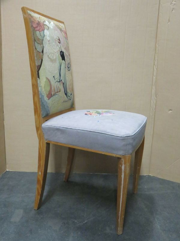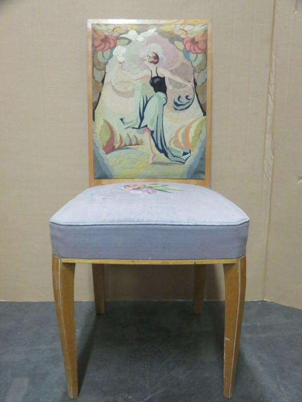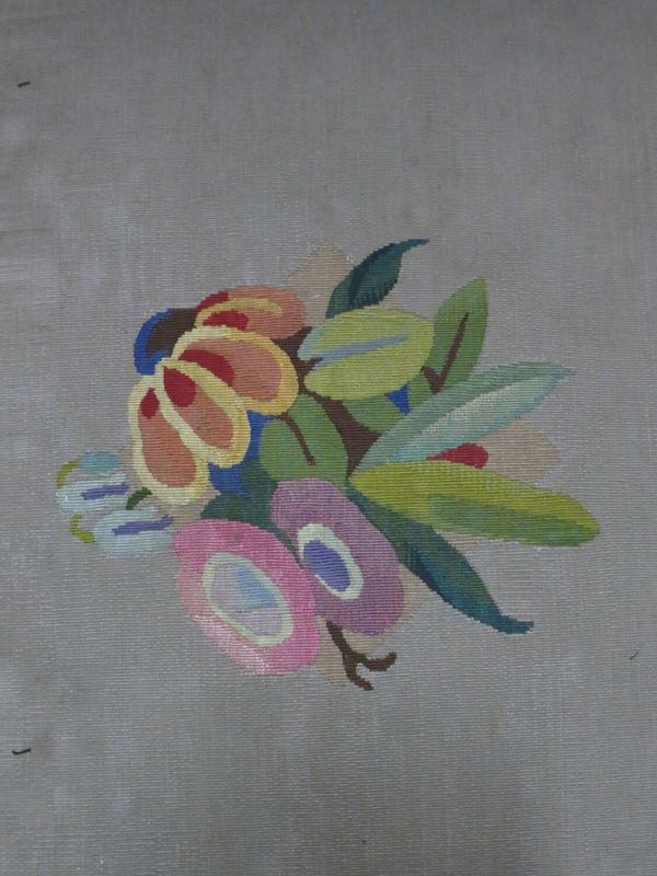 Tapisserie de Beauvais fond ardoise à bouquet floral synthérique central, sur le fond ; au dossier dans un cadre synthétiques de fleurs et de nuages, une femme, symbolisant le printemps, sur la pointe du pied tient une colombe et une plume dans chaque main. Elle se situe dans une prairie bordée d'arbres.
