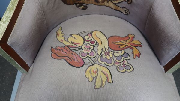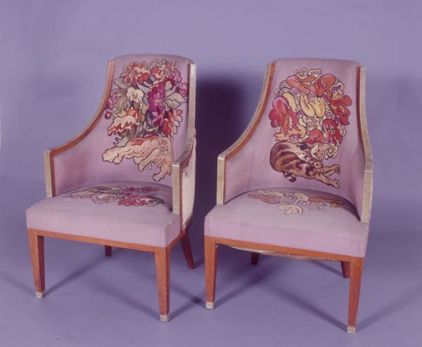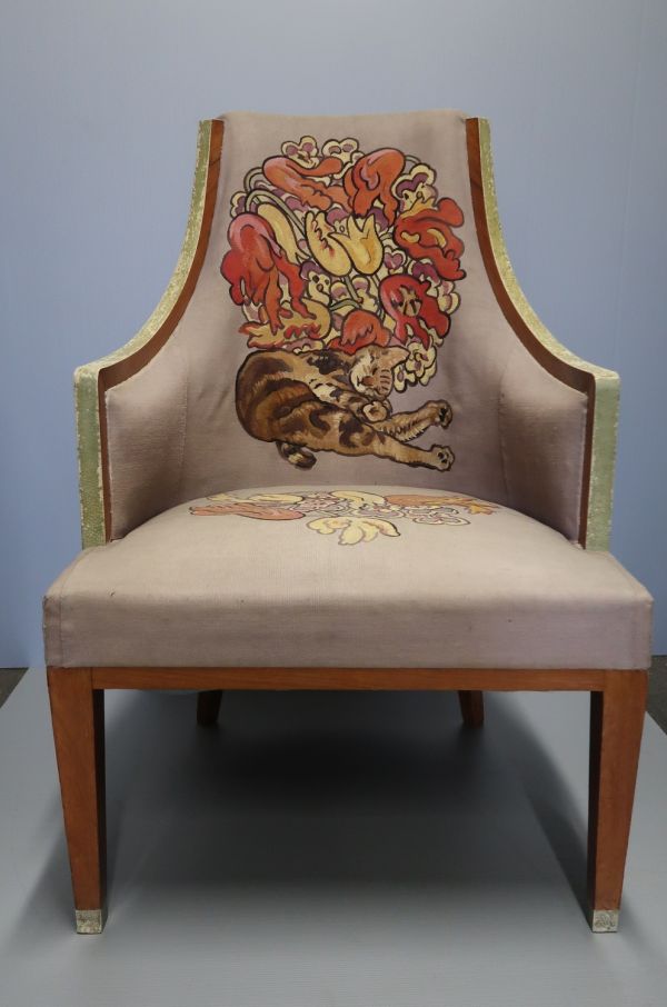 Du meuble n° 38 de la manufacture de Beauvais, "Les Chats", tissé entre 1926 et 1928 sur des cartons de Louis Valtat et monté en 1933 sur des bois en palissandre de Rio et galuchat de Marcel Coard, commandés le 26 juillet 1932. L'ensemble se compose d'un canapé (GMT 25479), deux fauteuils (GMT 25480), deux chaises (GMT 25481) et un écran (GMT 25482).
