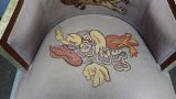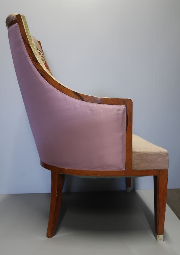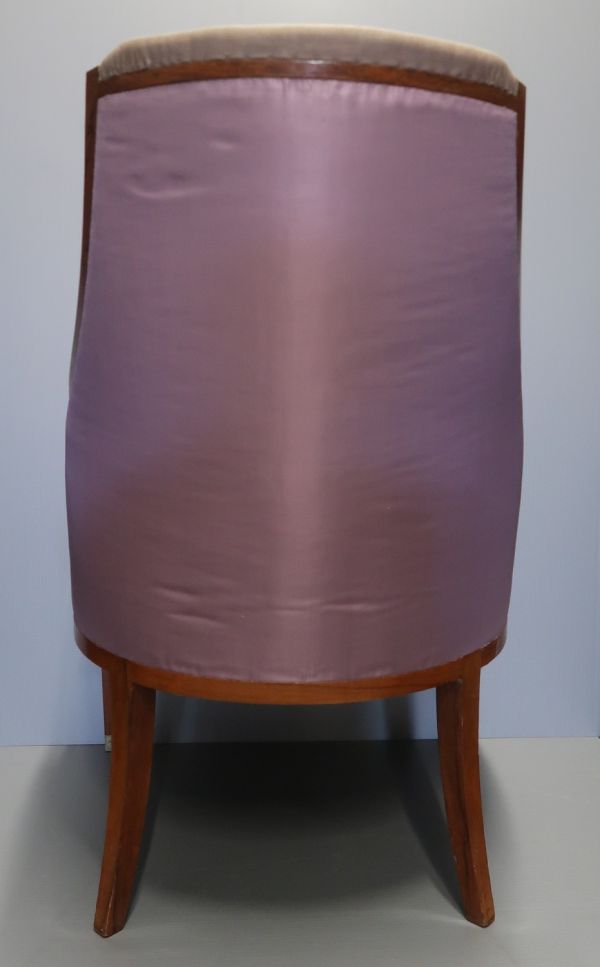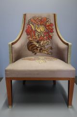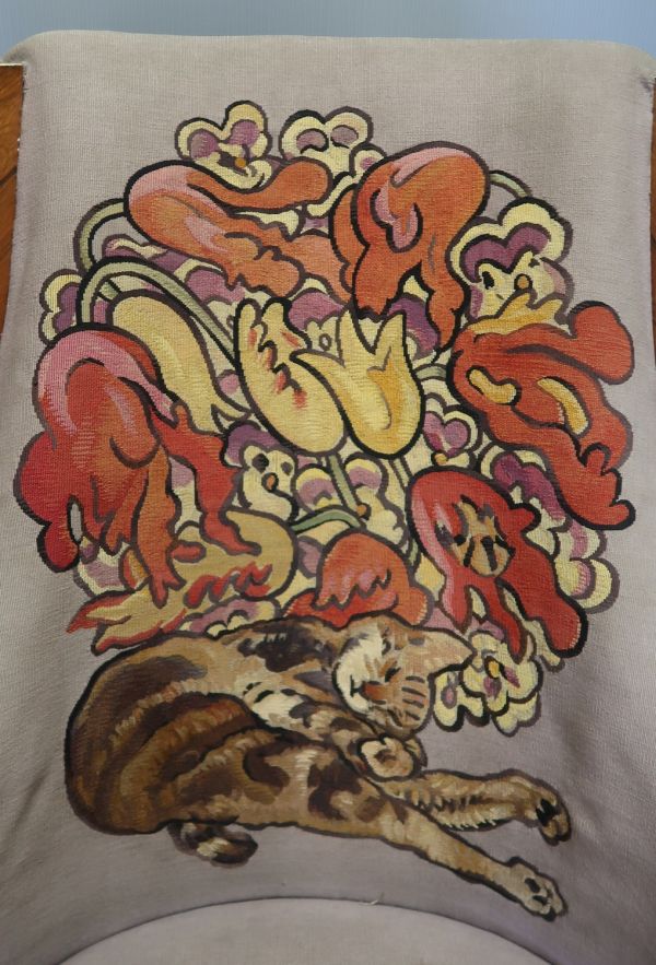 Bergère en palissandre de Rio, verni et appliqué de galuchat, garnie d'une tapisserie de Beauvais à fond violet (passé) avec motif sur le dossier d'un chat allongé sous un bouquet de fleurs stylisées ; bouquet d'orchidées, de tulipes et de fleurs jaunes sur la tapisserie de l'assise ; entoilage extérieur du dossier en soie (?) violette unie.