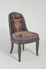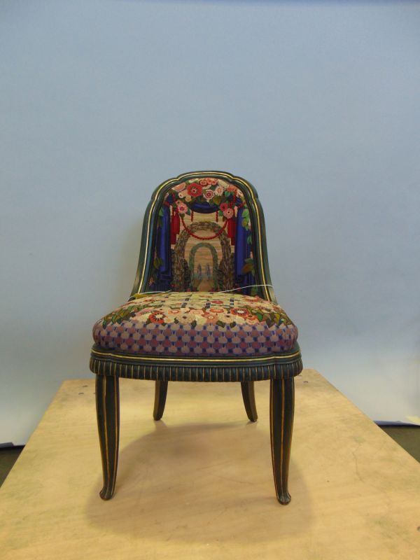 Pieds antérieurs à section circulaire, décorés de grosses nervures. Pieds postérieurs sabre. Ceinture décorée de godrons. Devanture excurvée à partie supérieure chantournée, siège mobile garni de tapisserie de Follot. Siège, décor fleurs et feuilles. Dossier, un rideau de théâtre s'élève et couvert de fleurs, laisse apparaître un parc.