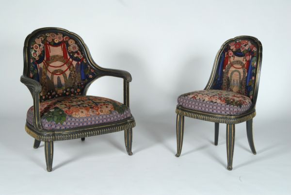 Du meuble n° 31 de la manufacture de Beauvais, "Le Parc", tissé entre 1924 et 1929 sur des cartons de Paul Follot et monté sur des bois du même, en hêtre sculpté et en partie doré. L'ensemble devait comprendre deux fauteuils (GMT 25668), deux chaises (GMT 25669) et un canapé ; en 1933, il fut décidé de remplacer le canapé par deux chaises, qui furent fabriquées mais non garnies (MB 655).
