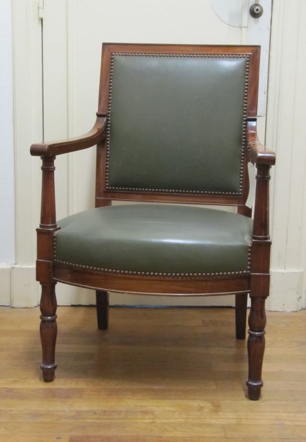 Pieds antérieurs en double poire à 3 bagues. Pieds postérieurs sabre. Ceinture demi criculaire à devanture droite. Supports d'accotoir carrés prolongeant accotoirs. Dossier concave à panneau bois sur 2 montants rectilignes. Siège à épaisseur. Cuir havane à clous touchant.