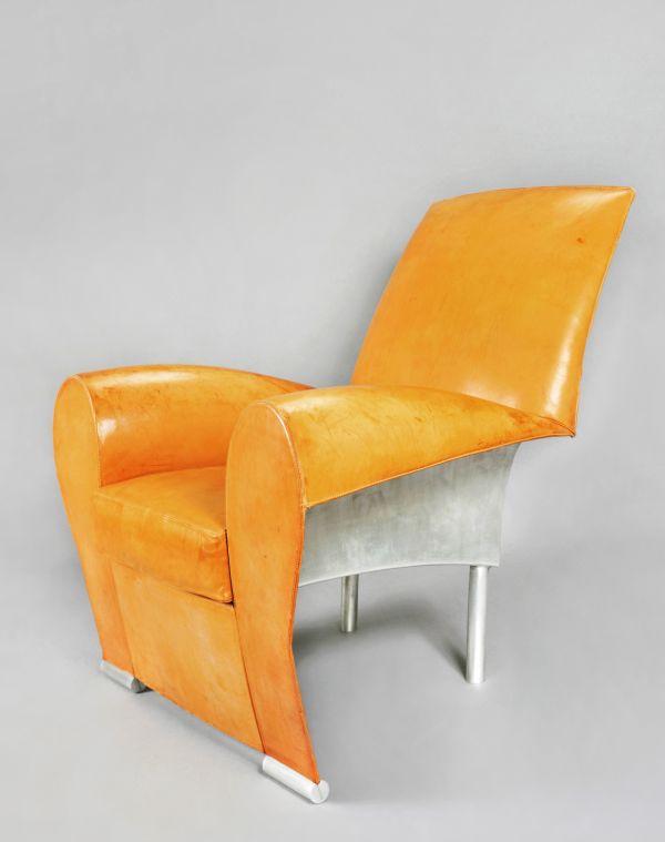 Piétement antérieur constitué de deux petits cylindres horizontaux soutenant plaque sur chant couverte de cuir. 2 pieds postérieurs sabre. L'ensemble supporte siège en aluminium moulé suivant la forme d'un fauteuil confortable "club", au dossier incliné vers l'arrière et aux larges accotoirs arrondis, le tout recouvert de cuir fauve.