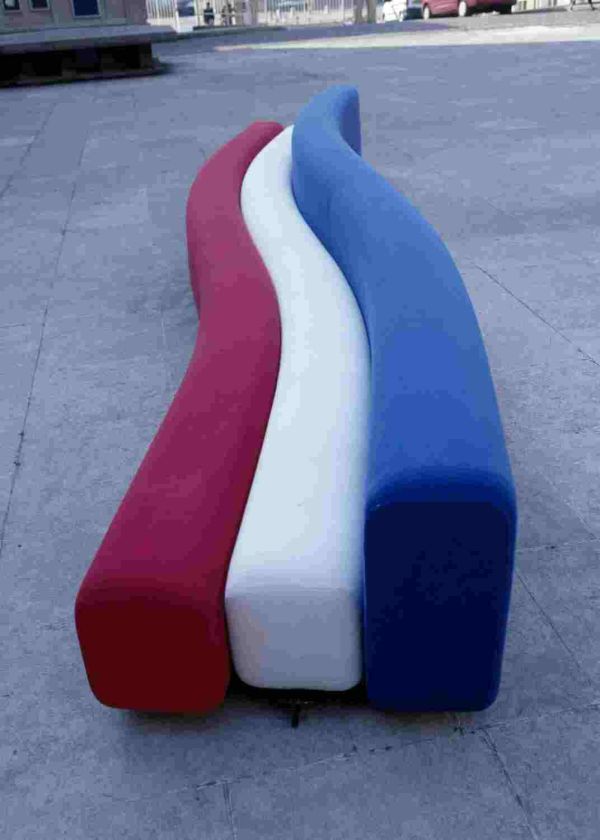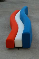 Canapé" banquette réalisé à partir de 3 éléments longs ("boudins") en mousse souple garnie de jersey tricolore. Deux de ces éléments forment l'assise et un le dossier. Ils sont articulés entre eux à l'aide d'une structure tubulaire interne qui permet de donner au canapé une géométrie variable.