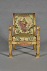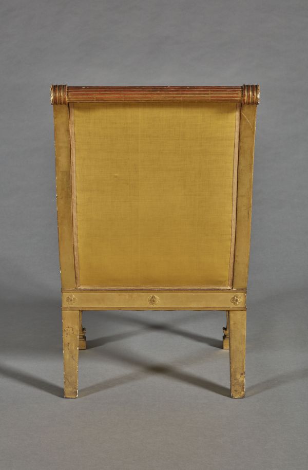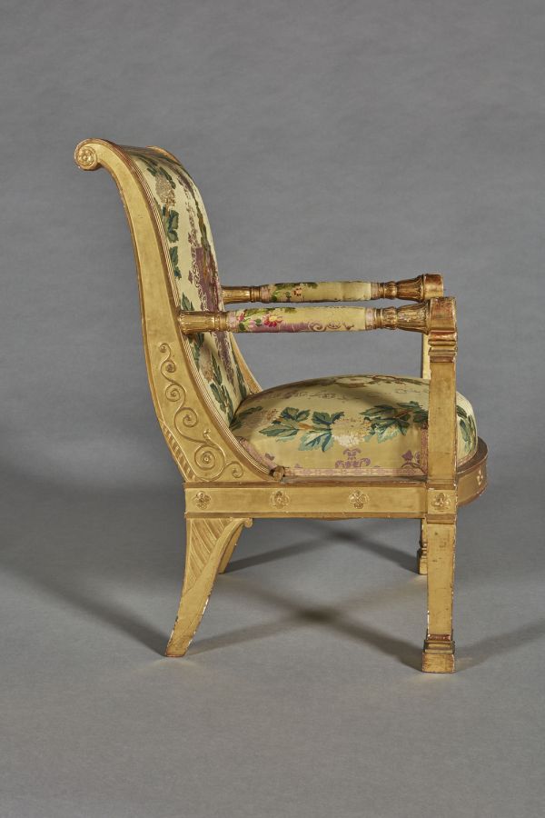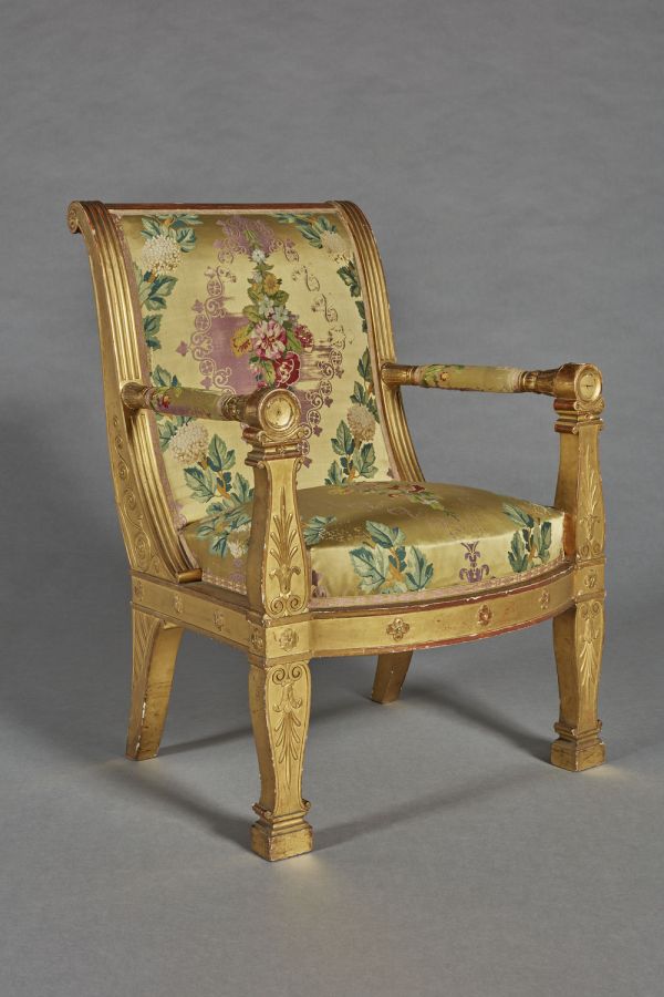 Fauteuil exécuté par la société « Jacob Desmalter et Cie », association de François-Honoré-Georges Jacob, dit Jacob-Desmalter (1770-1841), et de son père Georges (I) Jacob (1739-1814), menuisiers-ébénistes, active de 1803 à 1813.