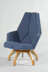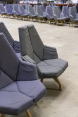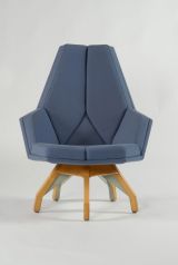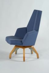 Piètement en sycomore à 5 branches sur patins plats chromés, disposées comme des pattes d'araignée, et réunies sous le siège au centre. Celui-ci est de forme "baquet" (assise accotoirs et dossier monobloc) en mousse découpée suivant formes géométriques et garnies de tissu bleu gris.