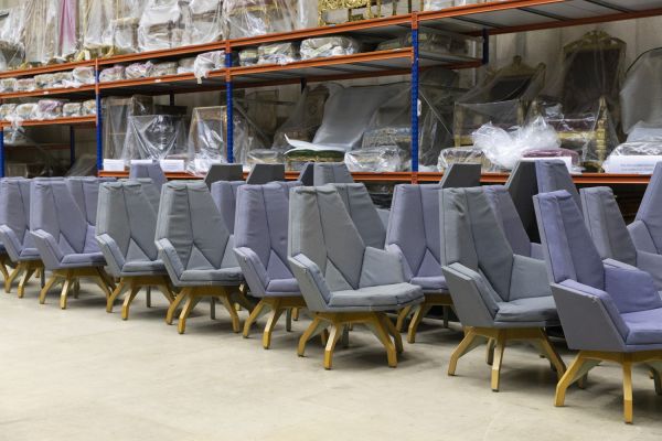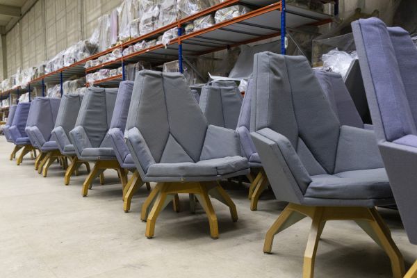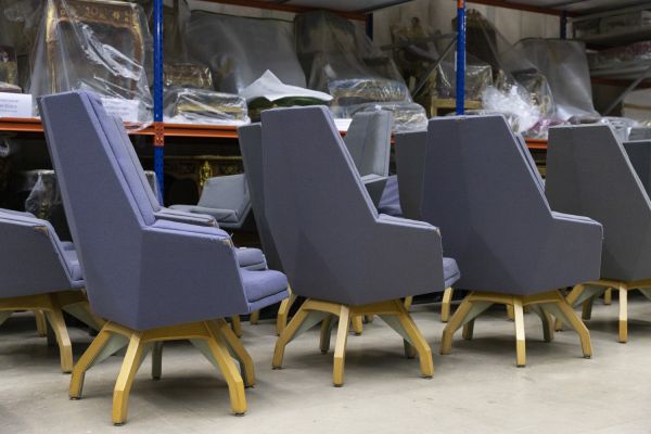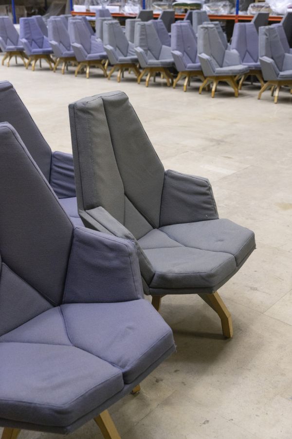 Sycomore décoloré verni, tissu de laine bleu gris sur mousse.