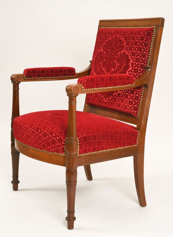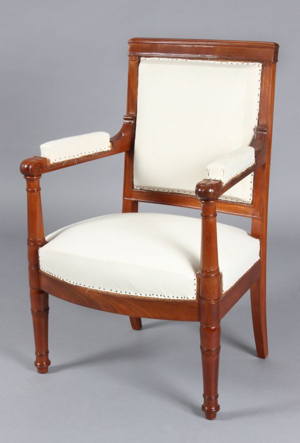 Montants avant tournés à bagues festonnées, accotoirs à manchette et à tête arrondie, devanture convexe et ceinture unie, pieds arrière sabre, dossier carré à listels, assise et dossier garnis.