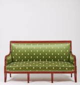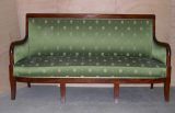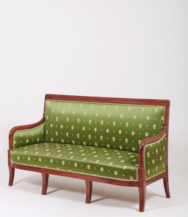 6 pieds sabre dont 4 en façade, devanture convexe, supports d'accotoirs en forme de cylindre baguée se prolongeant jusqu'au dossier auquel il se raccorde par une large feuille d'eau. Dossier incliné, traverse supérieure entre deux listels et surmontée d'une moulure en dos d'âne.