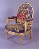 Pieds antérieurs d'angle en gaine, toutes faces à grosses cannelures ; pieds postérieurs sabre, moulurés. Ceinture moulurée, sculptée, chantournée en demi ovale, côtés, devanture draperies et fruits aux axes et têtes des pieds. Supports d'accotoirs en retrait et saillants sur la ceinture, moulurés, avec fausses draperies sous l'accotoir. Dossier dégagé, sommet en demi-cercle, base en doucine. Siège, dossier et manchettes à épaisseur.