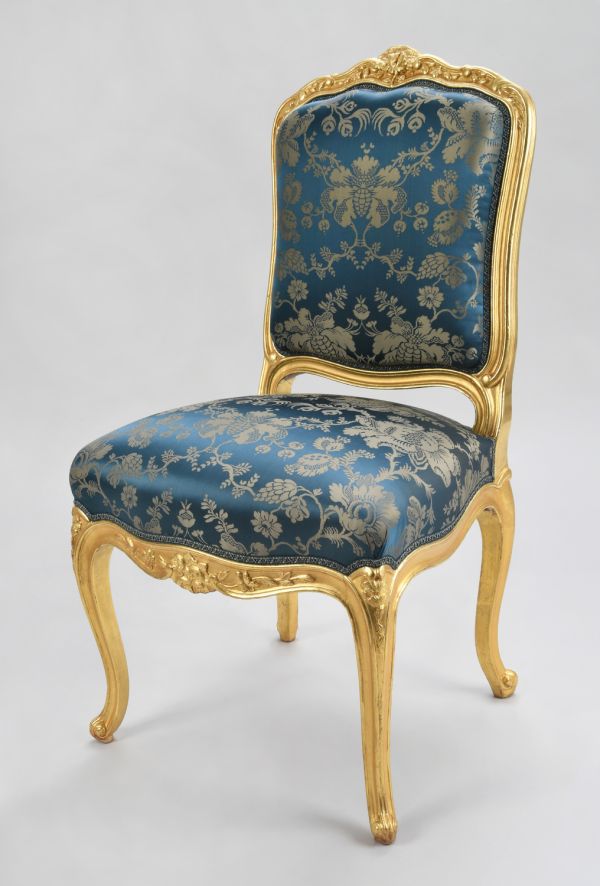 Dossier carré, dégagé, mouluré, chantourné, traverse supérieure sculptée de fleurs et feuillages, acanthe aux angles. Siège, dossier à épaisseur.