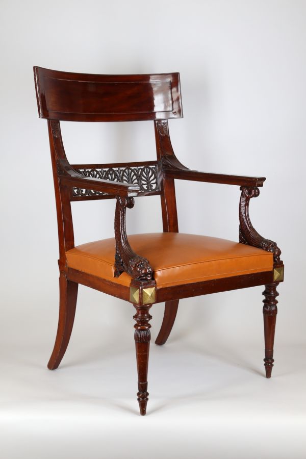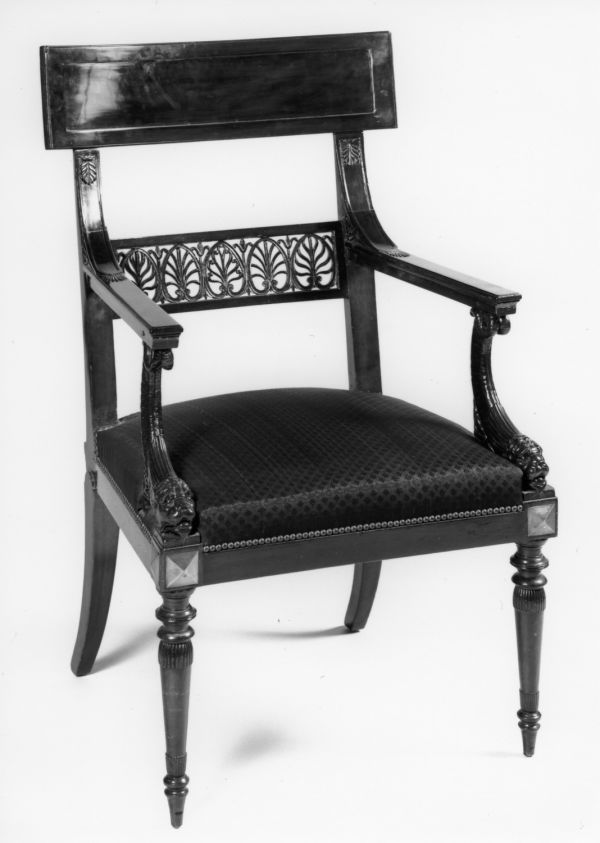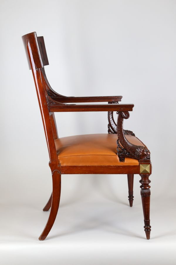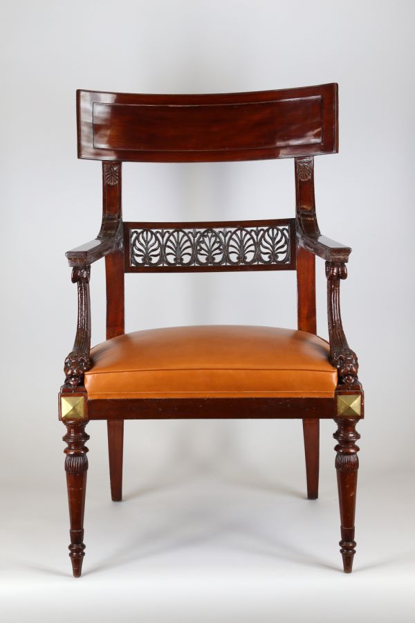 D'après Yves Carlier, l'origine serait plus ancienne et, au vu de la qualité et de l'originalité des pièces, il pourrait s'agir du mobilier exécuté par Jacob pour le duc de Chartres et saisi sous la Révolution : "20 fauteuils et 24 chaises, aussi de bois d'acajou, dans le genre étrusque, avec sièges de crin noir" (Rapport des commissaires Boizot, Lemonnier et Desmarest sur les œuvres d'art et objets précieux trouvés dans la maison d'Egalité, ci-devant Palais Royal, Nouvelles Archives de l'Art français, 3e série, t. 18, 1902, p. 234).