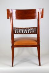 Dossier ajouré avec, à mi-hauteur, une frise de palmettes et de tigettes alternées. Traverse supérieure large et débordante.