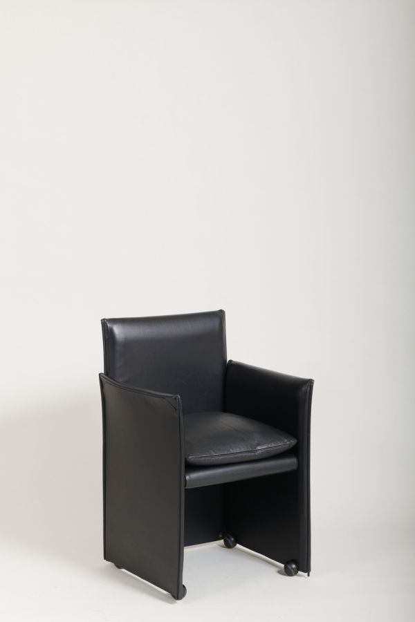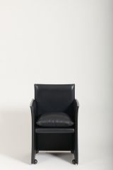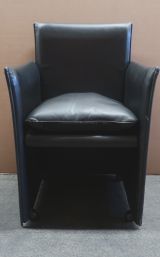 - Petit fauteuil entièrement garni de cuir noir, globalement cubique avec côtés pleins, droits, formant accoudoirs.