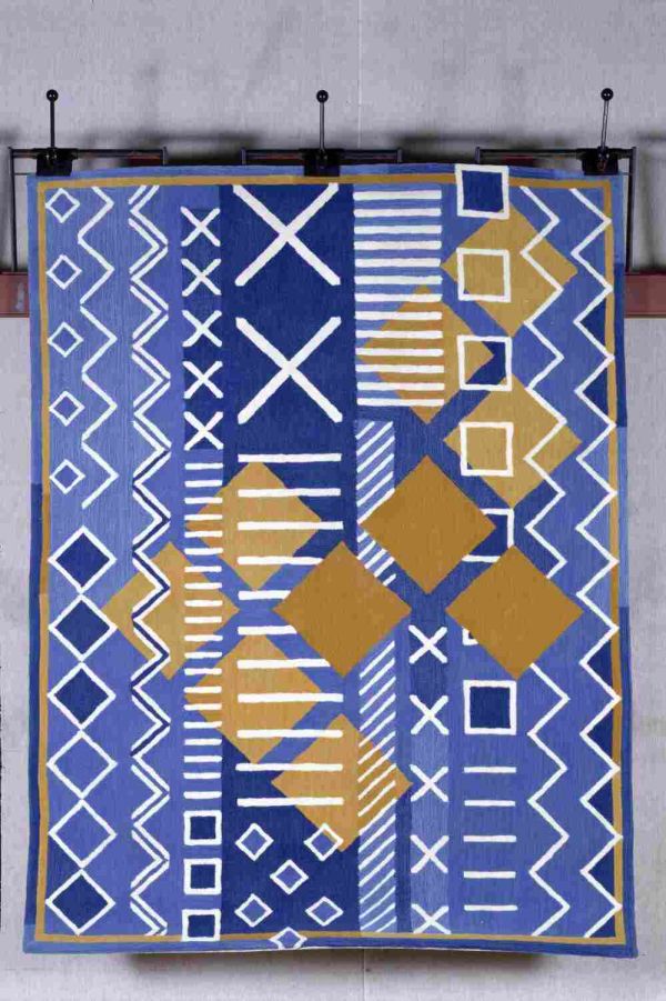 Sur un fond bleu ( 2 tons ) à listel moutarde se détachent dix grands carrés moutardes et diverses figures géométriques au trait blanc ( carré, croix, zig-zag , losange ) .