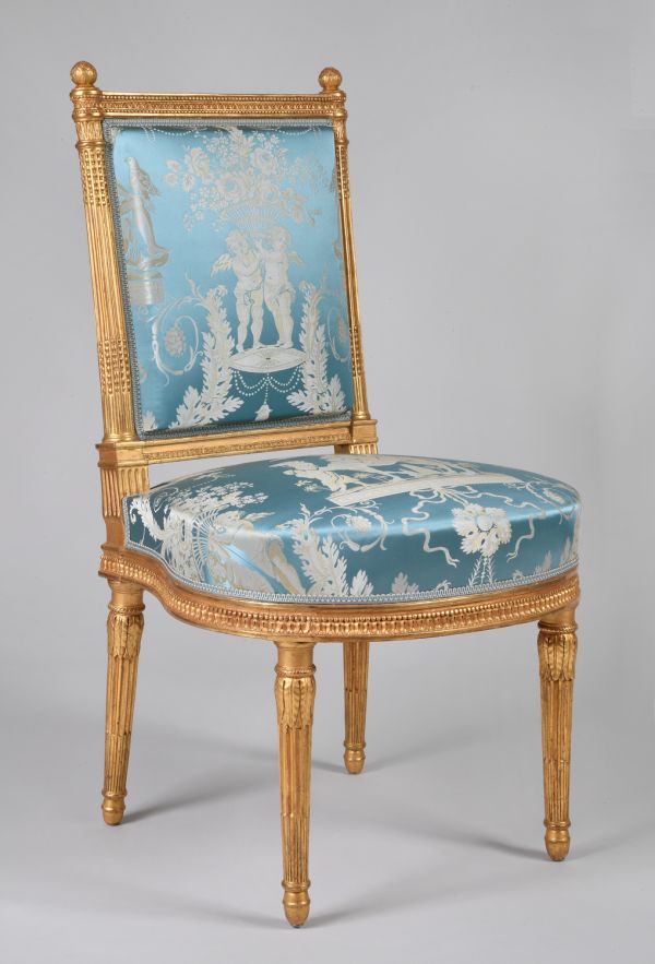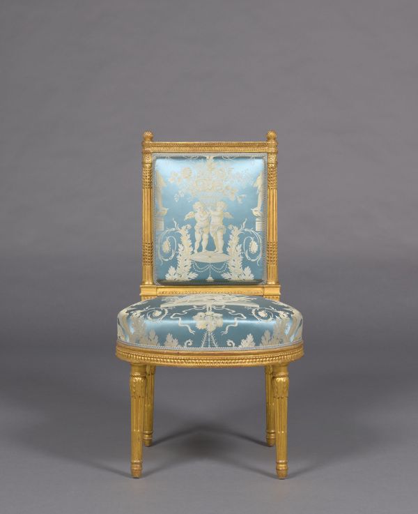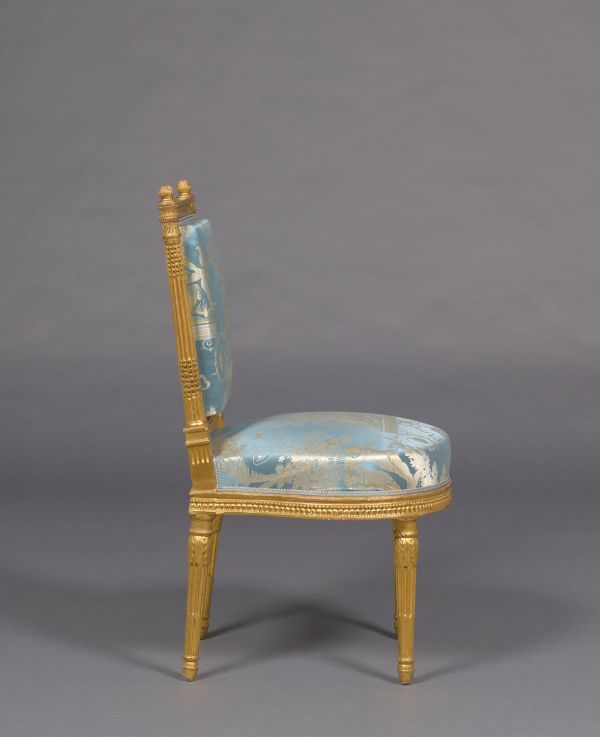 D'un ensemble de quatre chaises (GMT 3193/3 à 6) exécuté au milieu du XIXe siècle pour compléter un ensemble originel d'au moins quatre fauteuils (GMT 1403/1 et 2, GMT 3192/1 et 2) et deux chaises (GMT 3193/1 et 2), attribué à Georges (I) Jacob (1735-1814).