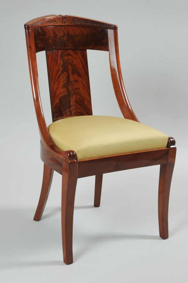 Versement de la Cour des comptes, palais Cambon, 13 rue Cambon, Paris 1er arr., au Mobilier national, le 28 septembre 2007 : "1 chaise. Chaise gondole. Acajou. Empire. 19e siècle. Dimensions : 0,80 m x 0,47 m x 0,39 m." (Mob. nat., registre d'inventaire des meubles garnis de tissu, vol. 13, p. 260, GMT 32495).