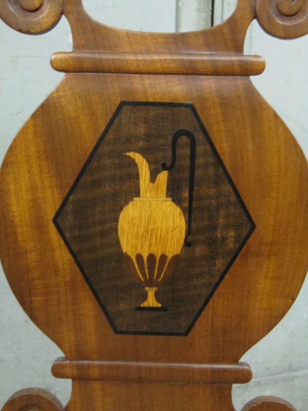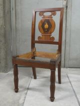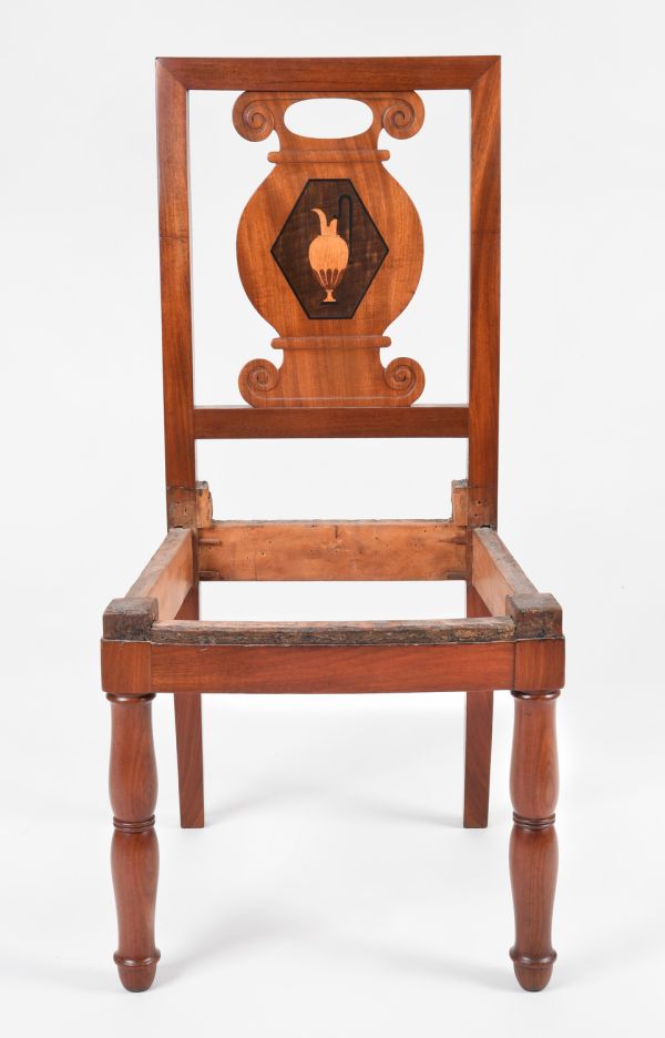 Dossier et assise carrées. Dossier à jour en cercle avec deux chapiteaux ioniques, main de préhension. Au centre marqueterie de bois teinté dans un hexagone, représentant une aiguière sur fond noir. Pieds antérieurs en balustre bagué. Pieds postérieurs en sabre.