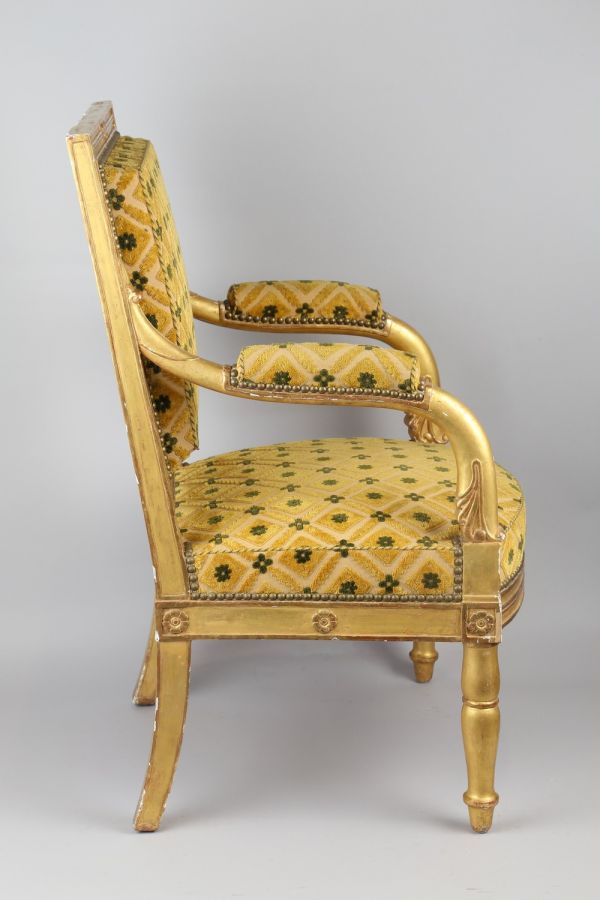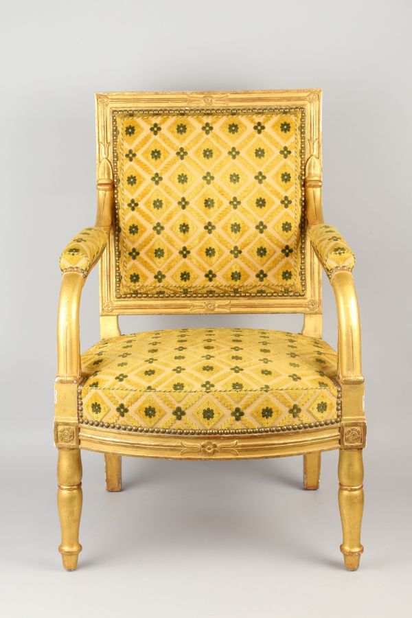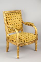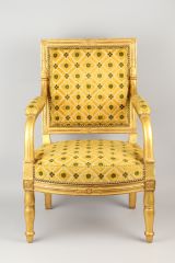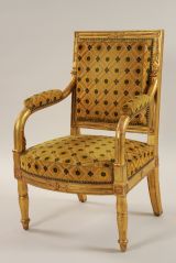 Fauteuil exécuté par la société « Jacob Desmalter et Cie », association de François-Honoré-Georges Jacob, dit Jacob-Desmalter (1770-1841), et de son père Georges (I) Jacob (1739-1814), menuisiers-ébénistes, active de 1803 à 1813.