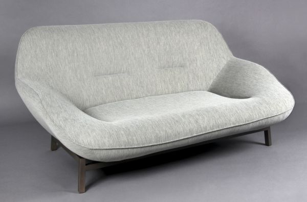 - Canapé de forme arrondie. Structure en acier et mousse, piétement en hêtre massif teinté anthracite, garni de tissu Uniform gris clair référence « Ash ». Moyen modèle.
