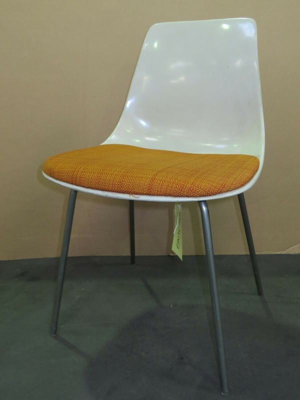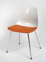 4 pieds en tube métallique reliés sous l’assise supportent le berceau du siège en forme de coque – en résine et fibre de verre blanche - moulée d’un seul tenant au dossier incurvé ; galette en mousse de polyuréthane revêtue de lainage orange.
