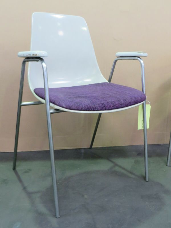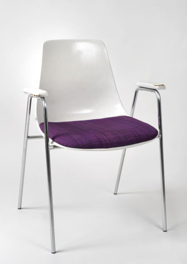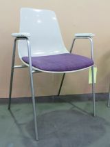 4 pieds en tube métallique se prolongent en U renversé pour former les supports d’accotoirs- petits accotoirs « manchettes » en bois laqué blanc ; le berceau du siège est en forme de coque – en résine et fibre de verre blanche- moulée d’un seul tenant au dossier incurvé ; galette en mousse de polyuréthane revêtue de lainage violet.