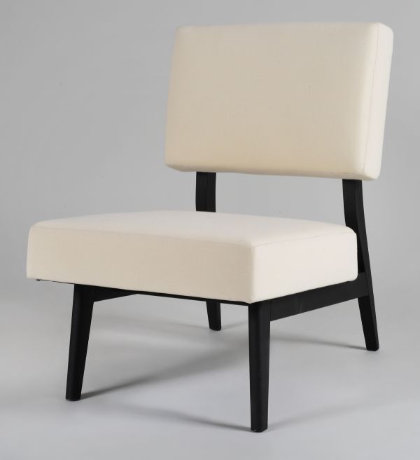 Chauffeuse en bois de frêne teinté, garnie de deux coussins rectangulaires séparés, un pour le dossier, un pour l’assise. Ces deux coussins épais sont débordants de la structure.