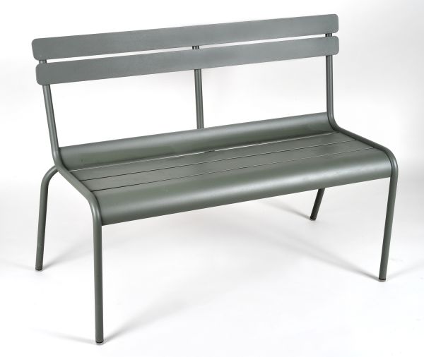 Banc de jardin trois places empilable, en tubes et lattes galbées d’aluminium laqué, coloris Romarin.