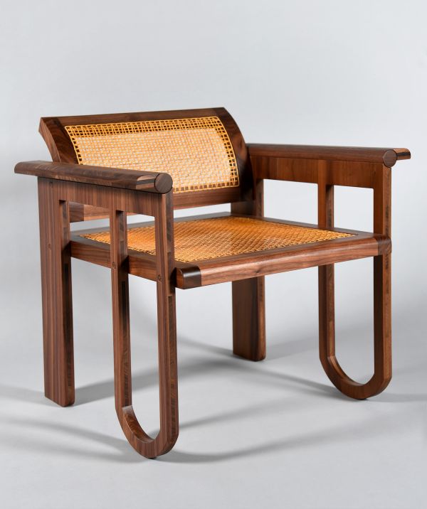 Assemblage de tri-plis français et de morceaux massifs de noyer américain. La canne de rotin a été achetée chez Les Rotins Nîmois et le cannage réalisé par le créateur. La fabrication du fauteuil est exclusivement française, avec une empreinte carbone faible et peu de déchets grâce à la récupération de la matière.