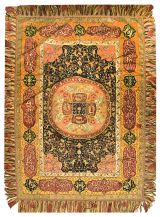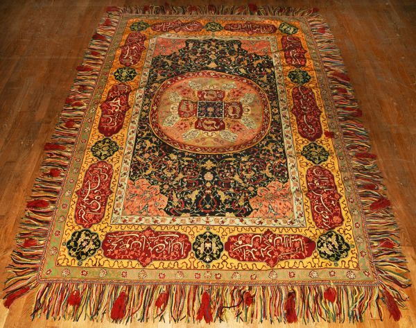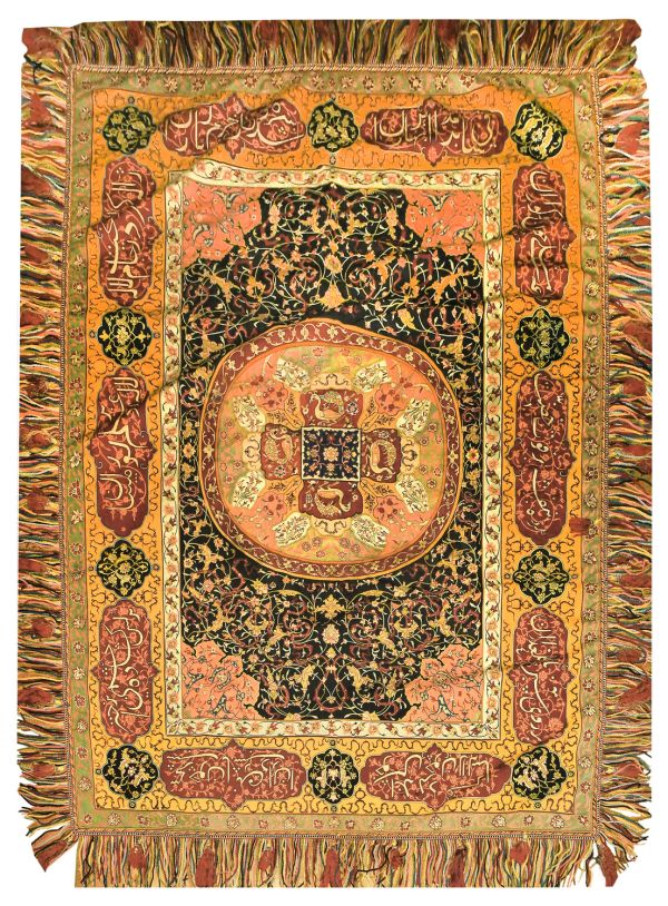Bordure d'entrelacs à fleurs stylisées, fond bleu ciell. large bordure à fond marron, avec médaillons à fond jaune, 3ème bordure d'entrelacs à fleurs stylisées sur fond gris; et terminés par franges à glands. Boublé satinette bleue.