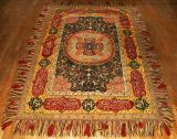 Centre circulaire avec rosace carrée et 4 compartiments ornés d'un oiseau et entourés de fleurettes et ornements. Cercle à petites rosaces sur fond grenat au milieu d'un enchevêtrement de petits rinceaux sur fond noir, dans un caisson rectangulaire, dont les écoinçons sont ornés de feuillages sur fond rose.