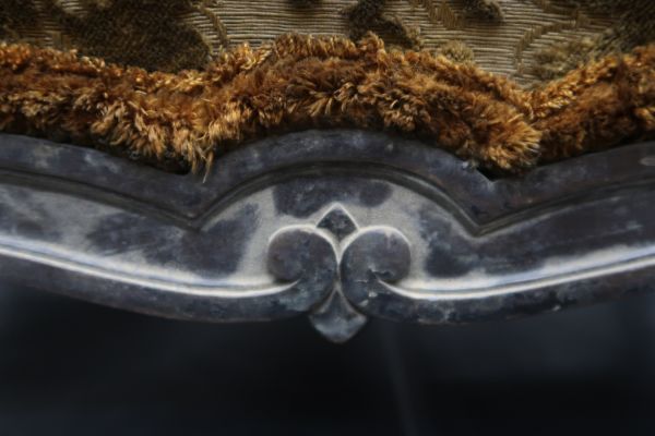 Bois noir. Quatre pieds galbés, moulurés, extrêmités à volutes. Ceinture droite chantournée, moulurée, à épaisseur sans ressorts. Velours de gêne brun mordoré.