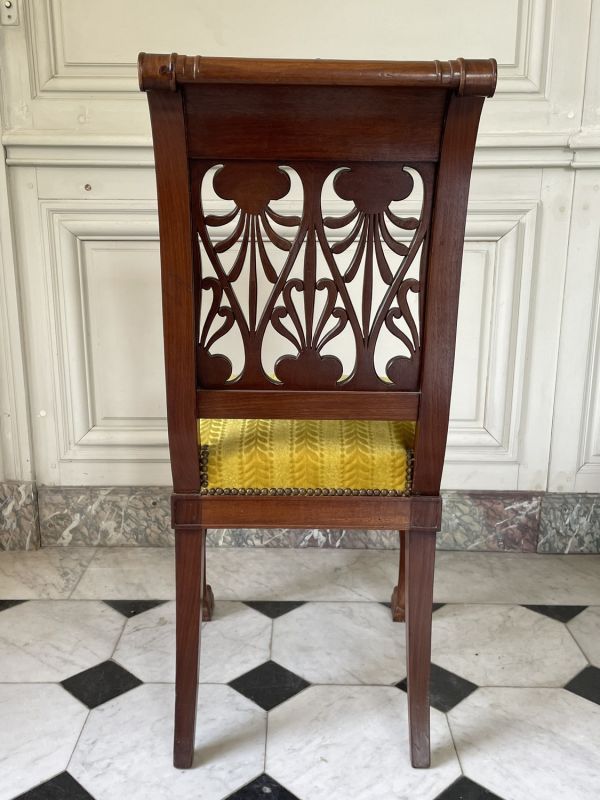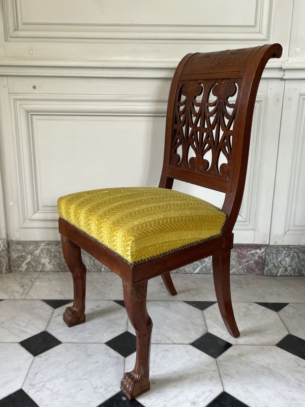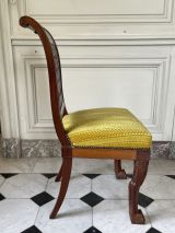 D'une suite de chaises commandées vers 1799 pour le palais du Directoire exécutif, actuel palais du Luxembourg, pavillon du Couchant, mais placées en 1800 au palais des Tuileries, dont huit dans la chambre à coucher de Madame Bonaparte, au rez-de-chaussée de l'aile sud.