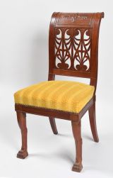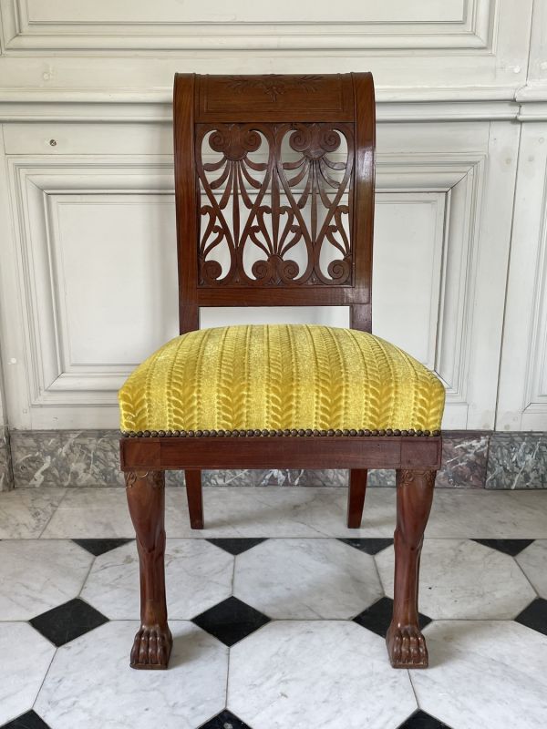 Pieds antérieurs en jarret monopode à griffes de lion sur patin carré, dorées comme les acanthes en écailles du sommet. Pieds postérieurs sabre, ceinture à fond creux sans dés. Dossier à montants en doucine, sommet à rouleau et volute, fond creux face et côtés. Traverse supérieure large s'enroulant à l'arrière et sculptée d'une rosace (quatre pétales) flanquée de culots et palmettes (dorée) cadre en fond creux. Tout le dossier chantourné, ajouré entre les deux traverses et formé de trois palmettes et deux demies, séparées de rinceaux en forme de coeur s'emboîtant les uns les autres.