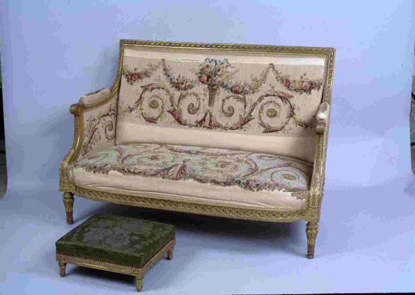 Cet ensemble a une triple origine : une partie (un canapé, deux bergères, six fauteuils et un écran de cheminée), exécutée en 1777-1778 par Jean-Baptiste Tillard (1685-1766), a été achetée en 1784 pour la venue du roi Gustav III de Suède à Versailles ; un complément de quatre chaises, a été commandé en 1785-1786 à Jean-Baptiste Boulard ; deux nouvelles chaises ont été ajoutées sous le Second Empire. L'ensemble est actuellement encore dans les collections du musée du Louvre, mais déposé au château de Versailles, comptant actuellement seize pièces : le canapé (OA 9359), les deux bergères (OA 9360 et OA 9495), les six fauteuils (OA 9361 à 9365 et OA 9496), les six chaises (OA 9366 à 9369 et OA 9497 et 9498) et l'écran de cheminée (OA 9370).
