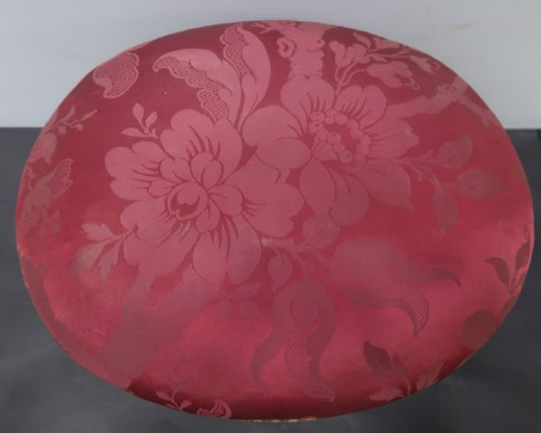 Bois doré. Quatre pieds tournés, cannelés, bagues, perles et feuillages. Ceinture ovale toute en rais de coeur, dés rectangulaires rosace saillante. Siège à épaisser, sans ressorts. Damas rouge.