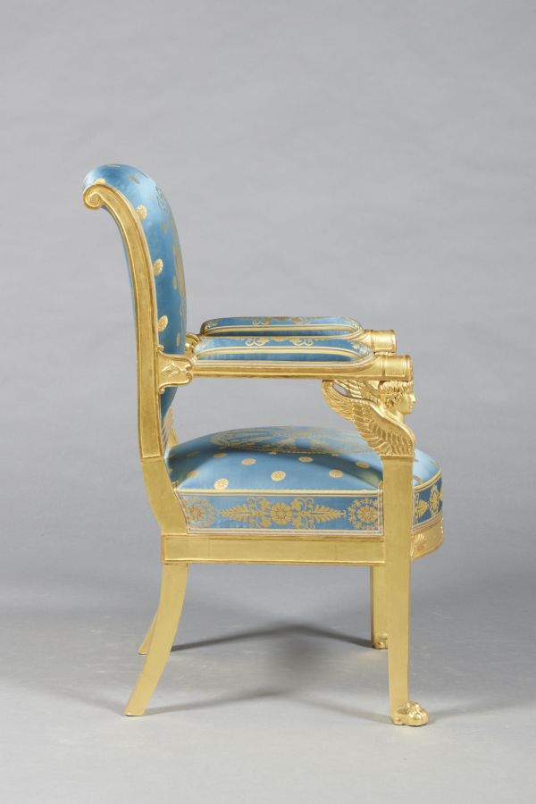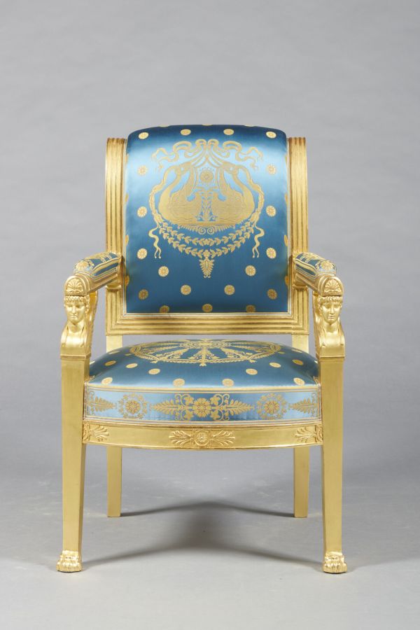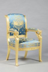 Pieds antérieurs gainés, formant supports d'accotoirs à griffes, et buste ailé - Pieds postérieurs sabre - Ceinture droite à fond creux - Devanture convexe, décorée de rosaces et palmettes - Accotoirs droits, à fond creux face à section demi-circulaire ornée en bout d'une palmette sculptée, raccord au dossier en lotus à fond creux sur les côtés, avec culot sculpté - Montants du dossier en doucine s'enroulant à volute, fond creux sur les côtés, 4 plates-bandes en façade comme la traverse inférieur - Traverse supérieure garnie - Siège et manchettes à épaisseur - Dossier à pelote.