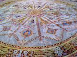 Grand caisson central circulaire à coeur en rosace or entouré en étoile de 12 motifs. 1° - d'anges ailés portant 2 rinceaux acanthe et 1 carré bleu mouluré or centre à coupe de fruits. 2° - vases blancs à anses et décors or à masque féminin de profil. Ces motifs alternés et séparés par guirlandes de fleurs rectilignes portant 1 cygne ailes déployés. L'ensemble à fond crème sauf le tour de l'étoile à fond gris formant le fond des cygnes. Couronne de feuilles de chêne à glands or et vert pâle fond brun, bordée moulure rais de coeur. Bordure de feuille et cerises fond blanc, rais de coeur et perles or. Aux 4 angles 2 bustes opposés de femmes ailées jouant de la trompe et se terminant en rinceaux d'acanthes ; sur les ailes panier fleuri fond rose. Aux extrémités, 6 carrés grenat bordés rais de coeur or à motif central attributs de musique dans couronne de feuillage et fleurs enrubannées. Bordure de branches, feuilles et cerises.
