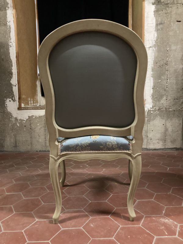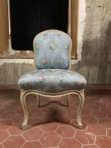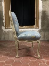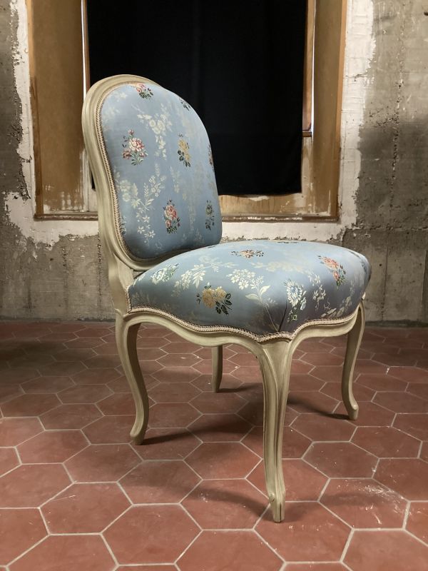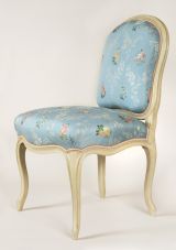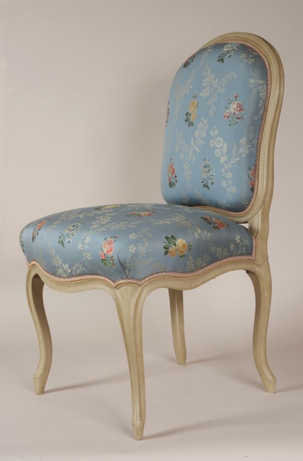 Pieds galbés moulurés, traverses galbées moulurées. Devanture convexe. Dossier violoné excurvé, moulure Couverte soierie, décor argent.