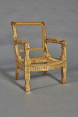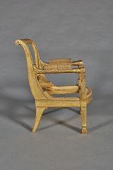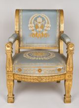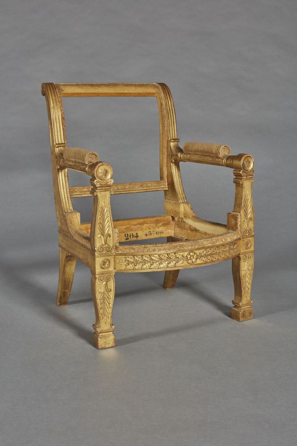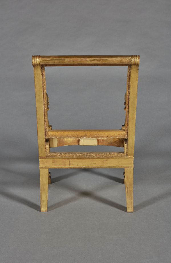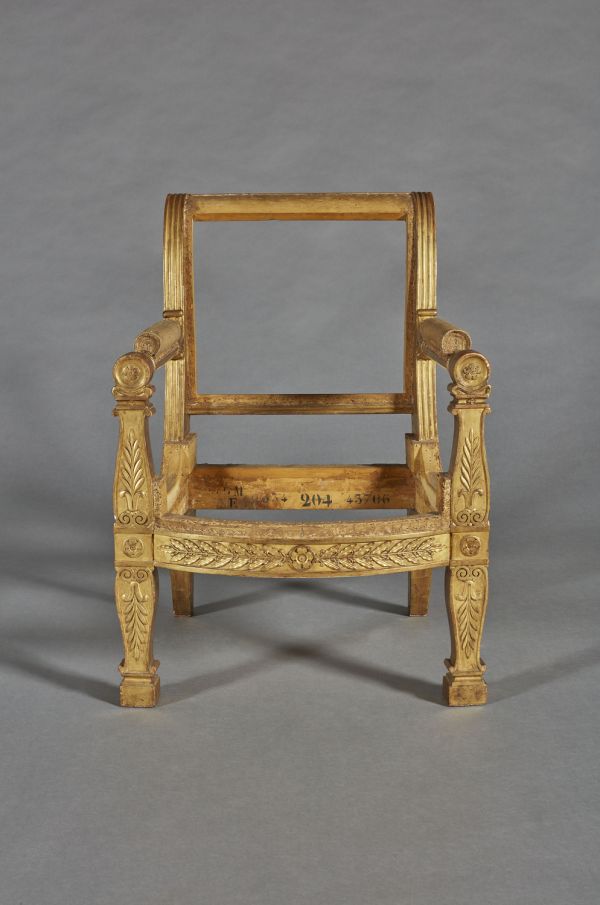 Fauteuil exécuté par la société « Jacob-Desmalter et Cie », association de François-Honoré-Georges Jacob, dit Jacob-Desmalter (1770-1841), et de son père Georges (I) Jacob (1739-1814), menuisiers-ébénistes, active de 1803 à 1813.