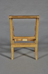 Bois doré et sculpté. Pieds antérieurs formant supports d'accotoirs de section rectangulaire chantournée en double poire. Dés séparant la base carrée à moulures, le sommet mouluré à doucine pour recevoir l'accotoir sculpté fond creux en façade s'enroulant en volutes prolongées par culot à feuilles. Pieds postérieurs sabre à doucine intérieure et fond creux côté. Ceinture à fonc creux. Devanture converse ornée d'une rosace centrale et deux branches de laurier. Accotoirs tournés façade concave à rosace, raccord en lotus à deux rouleaux. Montants du dossier dégagé en doucine large à la base, à fond creux sur les côtés, terminés en crosses à rosace centrale, face à quatre plate-bandes. Traverse inférieure en retrait à deux godrons. Traverse supérieure arrondie à godrons. Siège et manchette à épaisseur. Dossier à pelote plus épaisse vers le haut. Velours de laine plumetis, fond rouge, pois rouge et or. Lampas fond gros de Tours bleu.